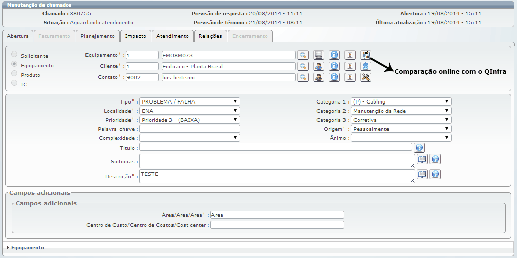 Na tela de atendimentos, quando ele possuir um equipamento ou IC atribuído, há um botão a mais no seu lado direito dessa informação. Esta opção faz uma comparação dos dados cadastrais do item, com os dados atuais do item no momento, através do QInfra. Veja a imagem abaixo: