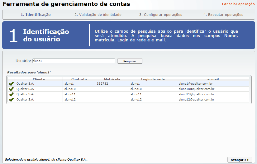 A identificação do usuário não é uma etapa utilizada pelo solicitante, quando o mesmo está utilizando o gerenciamento de contas através de um serviço do seu catálogo, pois o Qualitor considera que o próprio usuário logado no sistema já está identificado, e está efetuando este procedimento.