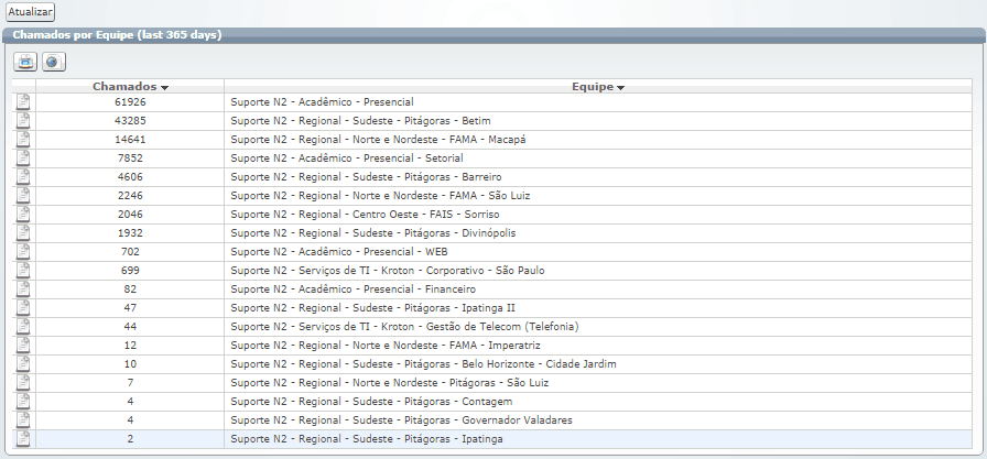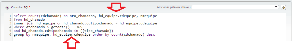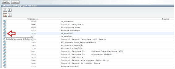 Para criar uma Grid Personalizada, devemos iniciar construindo a pesquisa que irá retornar os dados desejados. No exemplo abaixo, criamos uma pesquisa que retorna a quantidade de chamados registrada por equipe, nos últimos 365 dias: