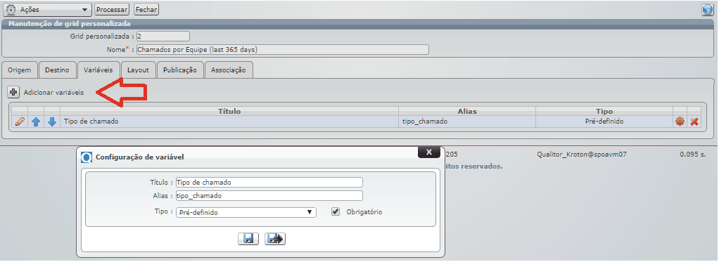 Dentro da configuração desta GRID Personalizada, podemos observar outras configurações, como por exemplo, uma área de Variáveis, onde podemos informar filtros a serem utilizados nesta pesquisa. No exemplo abaixo, estamos adicionando uma lista de valores para o “Tipo de chamado” utilizando como “Alias” para esta informação “tipo_chamado”.