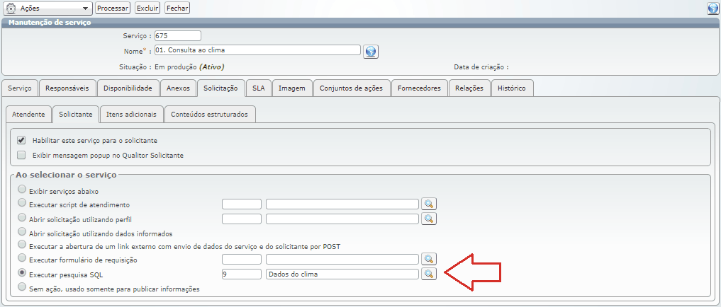Na terceira grid exibida, como o seu destino está configurado para acionar a classe de chamados, ao clicar na opção marcada no texto acima, o sistema exibe o chamado para o usuário.