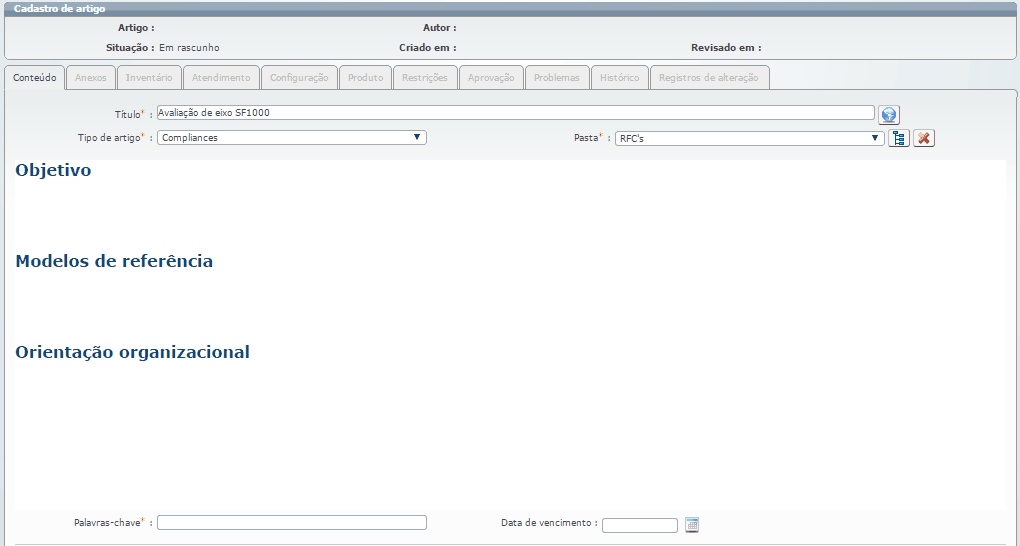 Isto significa que, durante o cadastro de um novo artigo, os cabeçalhos são exibidos como áreas independentes a serem preenchidas: