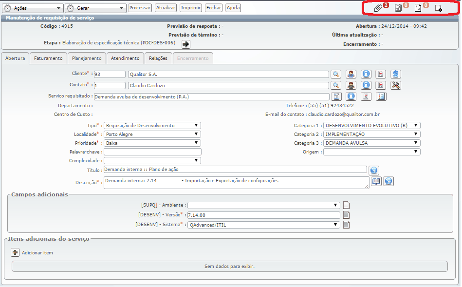 Desta forma, temos uma área de ações que permitem agilizar o atendimento ao cliente, facilitando o acesso às informações do Qualitor pelos atendentes.