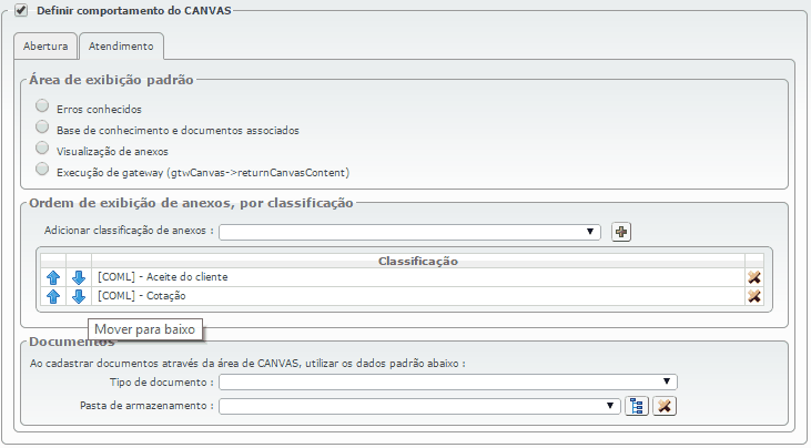 Na segunda área de configurações, também é possível definir, se documentos novos forem cadastrados pela área de CANVAS, como será a atribuição destes documentos quanto ao TIPO DE DOCUMENTO e quanto à PASTA DE ARMAZENAMENTO dos mesmos:
