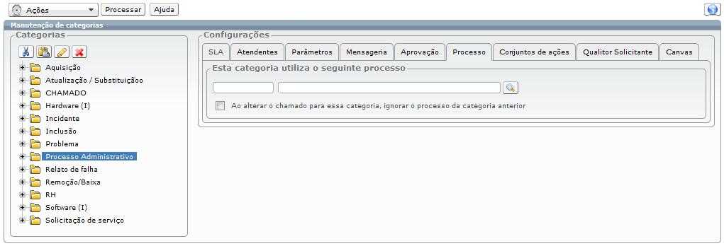 Abaixo, segue exemplo de uma categoria selecionada com a configuração na guia "Processo" para ser escolhido um processo a ser vinculado à ela: