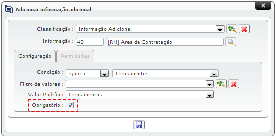 Os valores disponíveis do campo "Valor Padrão" são as opções de resposta disponíveis na informação adicional. Neste exemplo, o possível "Valor Padrão" pode ser "Financeiro" ou "Treinamentos":