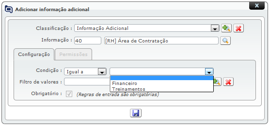 Pode-se selecionar um ou mais valores, dependendo da configuração que se deseja fazer. Os valores adicionados aqui serão as opções que serão exibidas para o usuário preencher a informação adiconal. Se nenhum valor for definido para o filtro, então todos os valores são apresentados para serem escolhidos quando a informação adicional estiver sendo preenchida.