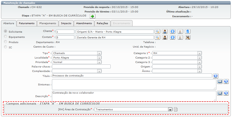 É importante mencionar que, na tela de requisição, as informações adicionais que forem configuradas nos cadastros de “Tipos” e “Categorias” serão exibidas juntas, nos “campos adicionais” localizados na parte inferior da tela de requisição (guia “Abertura”).