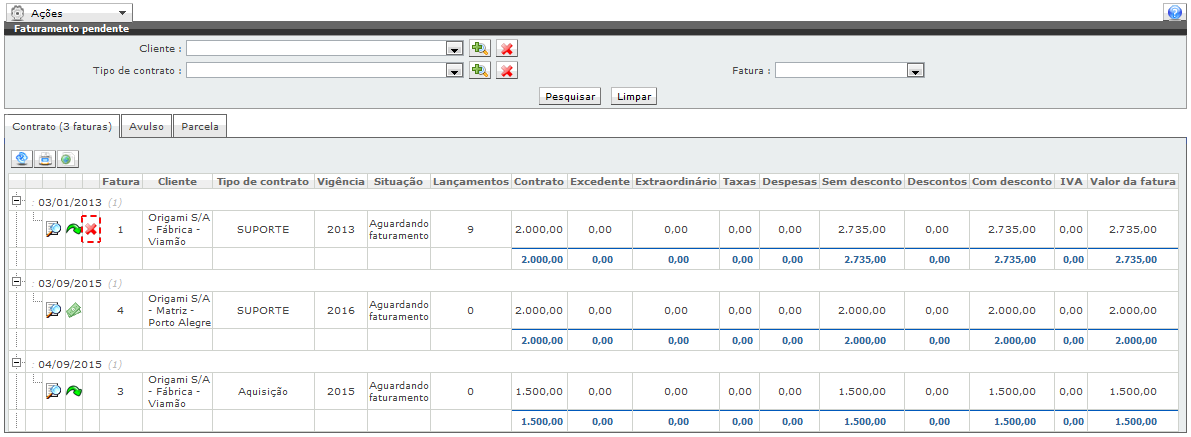 Ao tornar o contrato do cliente inativo e pesquisar os faturamentos pendentes, será exibido na fatura deste contrato a possibilidade de cancelar a fatura através do ícone