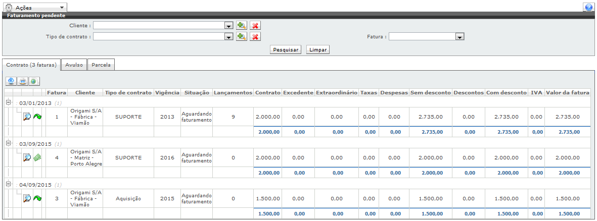 Nesta opção de menu serão listadas todas as faturas que foram canceladas, ou seja, faturas que se encontravam na situação de "Aguardando faturamento" e que por algum motivo tiveram que ser canceladas.