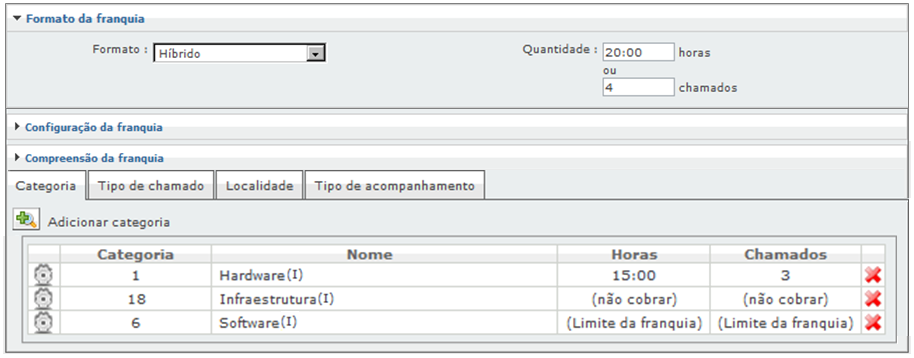 No exemplo abaixo, podemos visualizar um contrato cuja franquia possui formato híbrido e abrange atendimentos realizados às categorias “Hardware” e “Manutenção”.