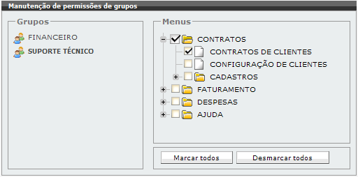 No exemplo a seguir, os usuários pertencentes ao grupo “Suporte Técnico” terão acesso apenas à opção de “Contratos de Clientes”, do menu “Contratos”.