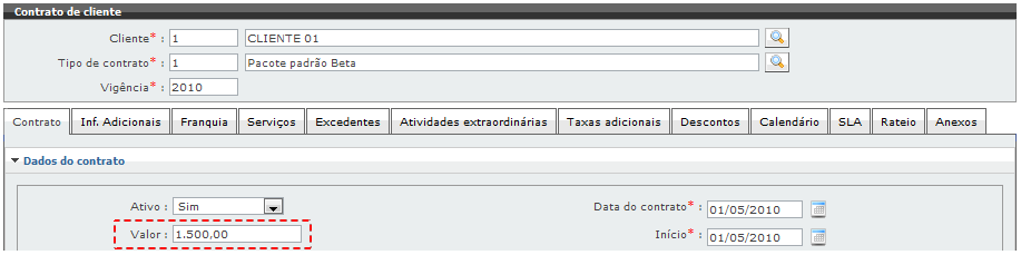 O contrato do CLIENTE 01 sofre uma alteração: o valor de R$ 1200, passará a ser R$ 1500, conforme as imagens a seguir: