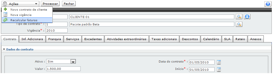 Para que essas alterações no contrato sejam repassadas para a fatura, faz-se o recálculo de faturas: