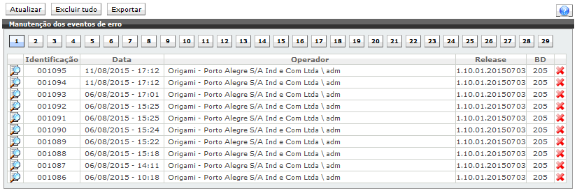 A lista apresenta os eventos detalhados por número de identificação, data, operador, release e banco de dados. Clicando no ícone