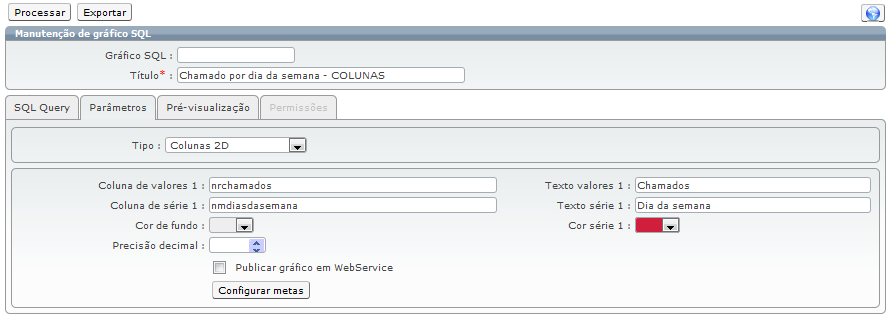 Na guia “Parâmetros”, defini-se o tipo de gráfico, os valores que serão representados pelo gráfico, cores personalizadas além de configuração de metas.