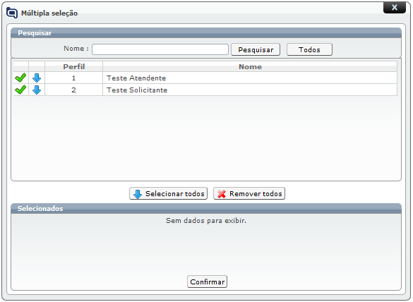 Clicando no botão "Todos" serão listados todos os perfis de conexão disponíveis no Qualitor Web e deve-se selecionar um perfil com modo de acesso para atendente, conforme é o cadastro que estamos configurando.