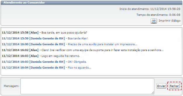 Ao clicar no botão “Fechar” será exibida uma mensagem para que o usuário final confirme o encerramento do atendimento: