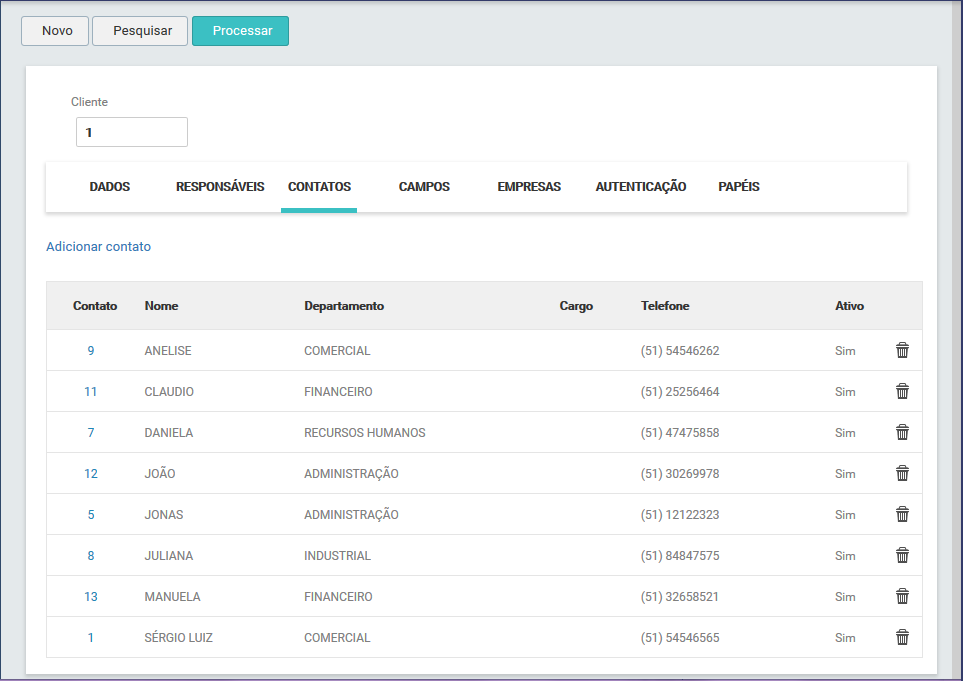 Depois de incluir os contatos do cliente, os mesmos são exibidos na grid de contatos: