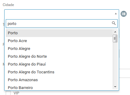 Depois de digitar dois ou mais caracteres o sistema automaticamente faz a pesquisa e já sugere as "Cidades" cadastradas para seleção, no exemplo abaixo, foi digitado os caracteres "porto" e as seguintes cidades foram sugeridas pelo sistema: