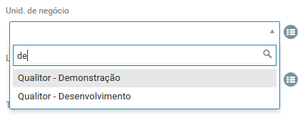 Depois de digitar dois ou mais caracteres o sistema automaticamente faz a pesquisa e já sugere as "unid. de negócios" cadastradas para seleção, no exemplo abaixo, foi digitado os caracteres "de" e as seguintes unidades de negócios foram sugeridas pelo sistema: