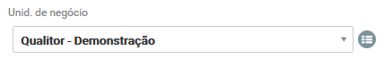 Nesta tela, através do campo "Pesquisar por" é possível pesquisar por uma determinada unidade, ou então, já selecionar uma unidade que se deseja clicando sobre o número de cadastro desta unidade de negócio. Como exemplo, foi selecionado a opção "Qualitor - Demonstração" e automaticamente a tela foi fechada e preenchido o campo "Unid. de negócio", conforme seguinte imagem: