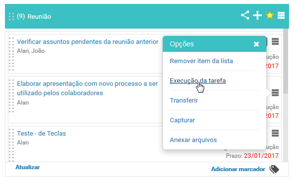 Depois da tarefa iniciada é possível registrar atividades e apontar horas trabalhadas quantas vezes forem necessárias até a finalização desta tarefa. Para isso, nas “opções de menu” clique em “Execução da tarefa”: