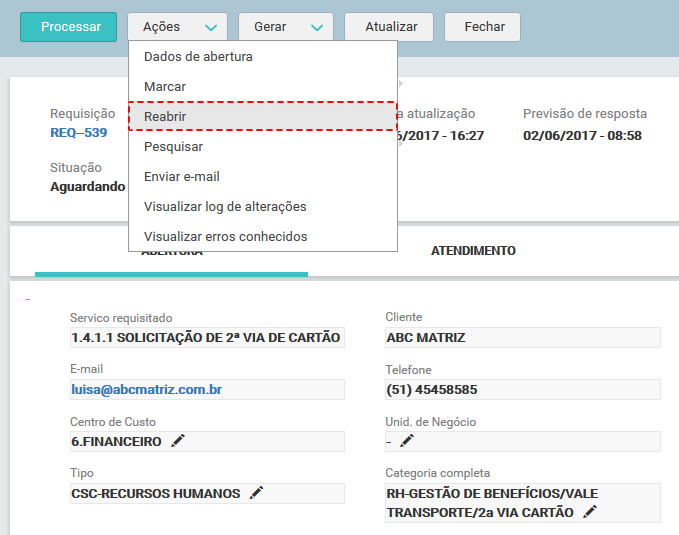 A partir da opção de menu Reabrir, é possível dar início a reabertura de uma determinada Requisição.
