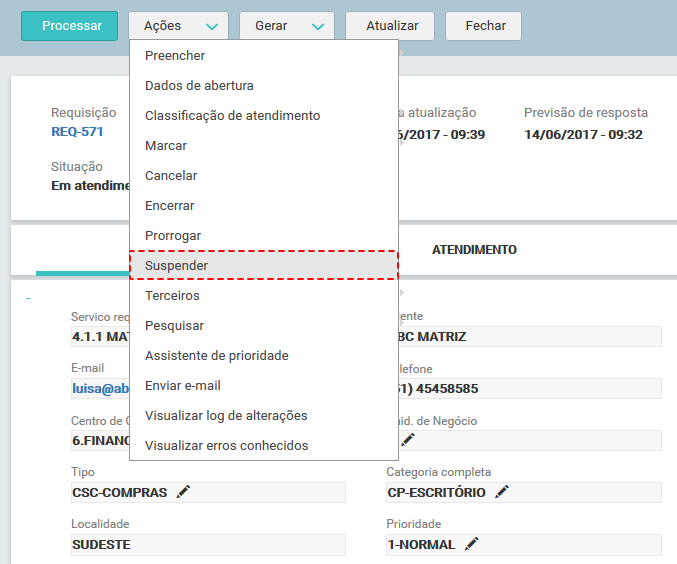 A partir da opção de menu Suspender é possível parar o atendimento da Requisição, incluindo a contagem do prazo de témino deste atendimento. Ou seja, através da opção Suspender o atendimento fica suspenso e deste modo, o prazo de término também é congelado, não contando este tempo de suspensão até a reativação deste atendimento.
