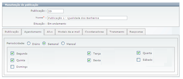 No exemplo acima, o lote de pesquisa será enviado de SEGUNDA a SEXTA-FEIRA, entre as datas de 31/07/2012 a 01/08/2012, conforme configurado também na guia “Publicação”.