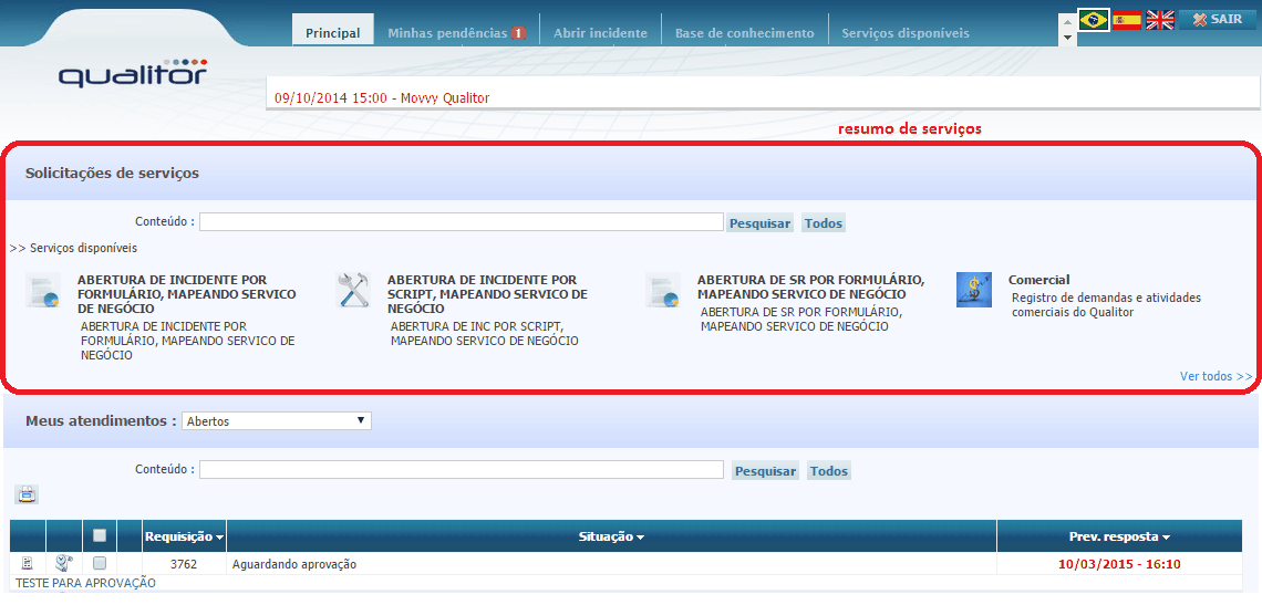 O Resumo de Serviços era exibido no módulo Web Solicitante, ao clicar nas opções “Principal”, e “Pesquisa de satisfação”: