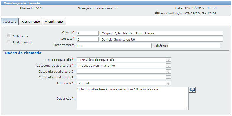 Uma vez que o destino do formulário está definido como “Chamado”, por exemplo, após o usuário final ter preenchido os campos e clicado em “Processar”, uma requisição será gerada no Qualitor.
