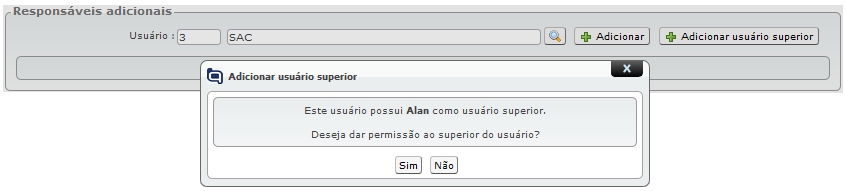 Ao selecionar um usuário como responsável adicional será possível adicionar o mesmo através do botão “Adicionar”, e logo será exibido a possibilidade de adicionar o superior imediato deste usuário através do botão ao lado, “Adicionar usuário superior”, que só estará habilitado para seleção caso o atendente informado tenha um superior imediato definido em seu cadastro, conforme seguinte exemplo: