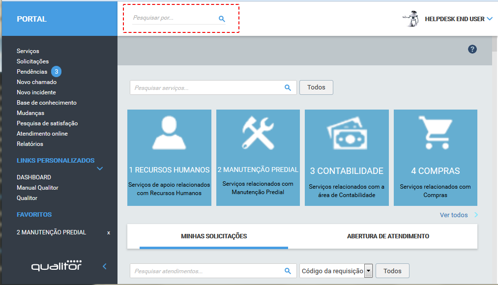 Abaixo da área de catálogo de serviços há a área de "Minhas solicitações" e "Abertura de atendimento", conforme destaque na imagem abaixo: