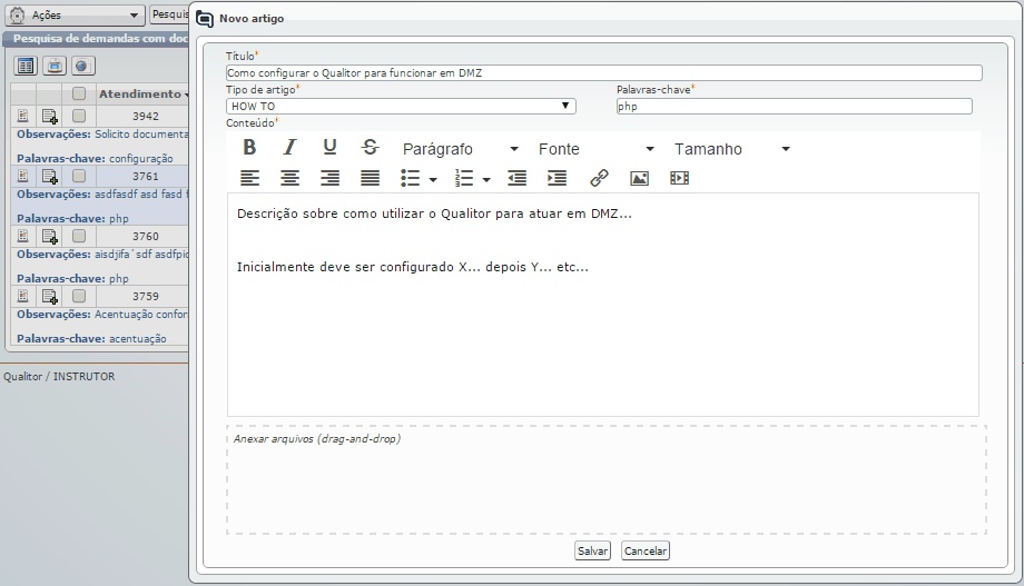 Neste momento o usuário têm condições de acessar o atendimento, analisar o histórico do mesmo e também realizar a criação destes artigos: