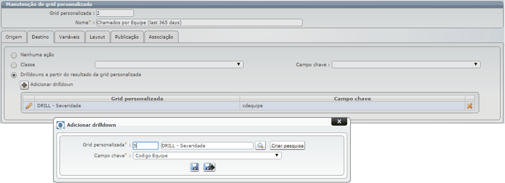 Agora, retornando à primeira GRID, nós apenas devemos configurar ela para acionar a segunda grid criada. Na configuração de “Destino” desta grid, configuramos ela para realizar o drilldown para a segunda grid, informando que será transferido o campo “Código equipe” (o qual é um campo invisível, e que está presente apenas para realizar esta operação):