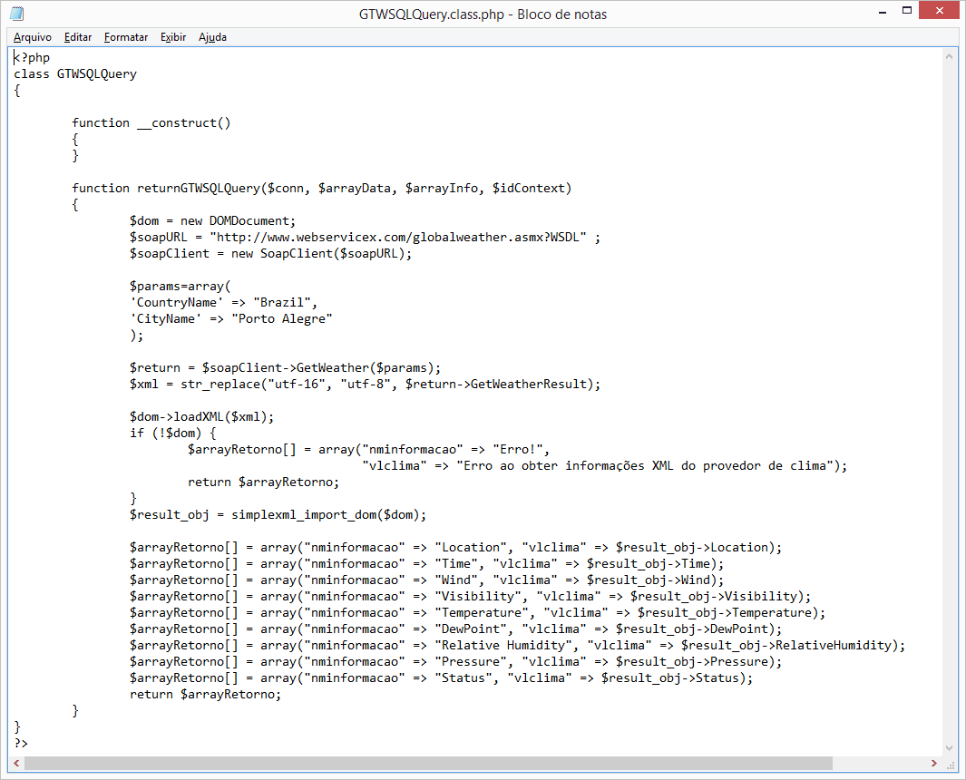 Para fins de exemplo, elaboramos um gateway que utiliza um Webservice bastante conhecido “GlobalWeather” para obter dados do clima. Vamos utilizar este WebService para obter dados de clima da cidade de “Porto Alegre” através do gateway e exibir os resultados em uma Grid Personalizada.