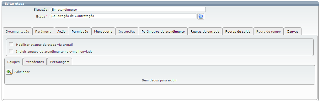 Na guia “Permissão” é possível configurar permissões para quem poderá passar o processo para a próxima etapa e isso inclui equipes, atendentes e personagens.