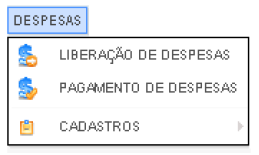 No menu “Despesas” definem-se as informações de “Liberação de despesas”, “Pagamento de Despesas” e “Cadastros”.