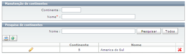 O sistema é preparado para possuir usuários e objetos de vários países, associados a continentes. O cadastro de continente é simples, basta inserir um nome e salvá-lo.