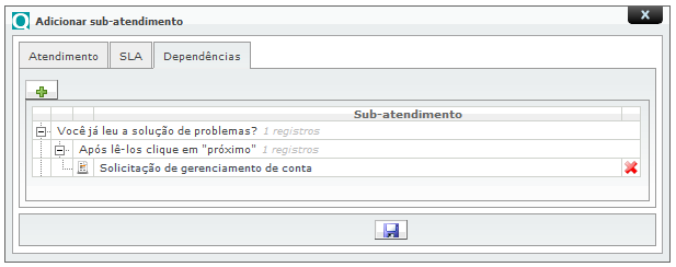 Na subguia “Dependências”, pode-se definir regras para o caso em que haja mais de um sub-atendimento programado; neste caso, é possível informar que um sub-atendimento só possa ser executado após o término de outro e assim por diante.