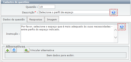 Ao editar uma questão, é possível notar botões ao lado dos textos de “Descrição” e “Instruções”. Estes textos são os textos que são exibidos durante a execução de um script, referentes à questão.