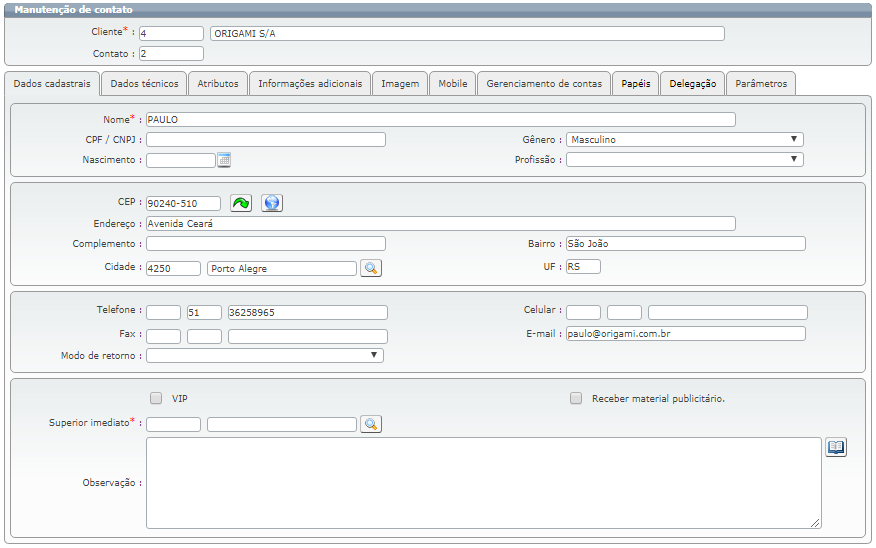 Além dos dados gerais, é possível cadastrar qual o “Modo de retorno” preferencial deste contato, que pode ser escolhido como telefone, celular, fax ou e-mail. Como também selecionar o contato como “Vip” e também indicar seu supervisor imediato.