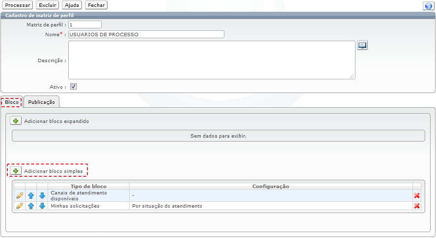 6.3. Clique em Processar para salvar e voltar a janela Cadastro de matriz de perfil.