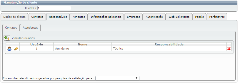 No cadastro de clientes existe uma guia na qual são configurados os atendentes responsáveis pelo cliente, onde é colocado um usuário do Qualitor.