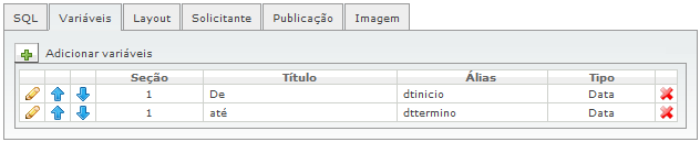 Através do botão “Adicionar variáveis”, qualquer variável que faça parte da Query é formalizada e configurada para o relatório da seguinte forma: