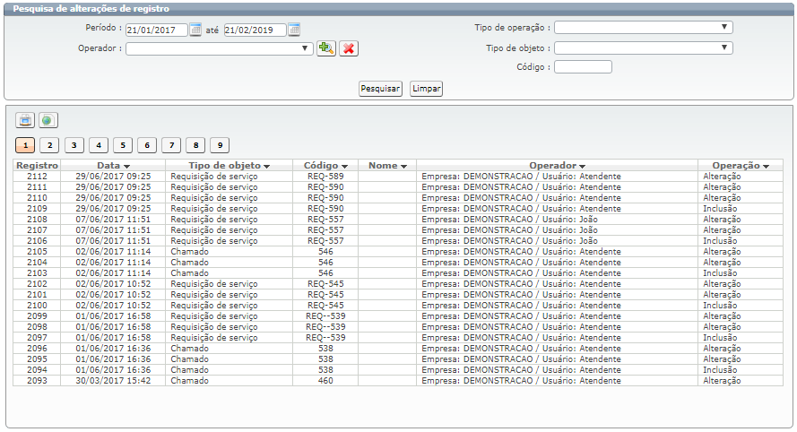 É possível filtrar o resultado definido por muitos critérios como: período (data), tipo de operação, operador que executou a operação etc.