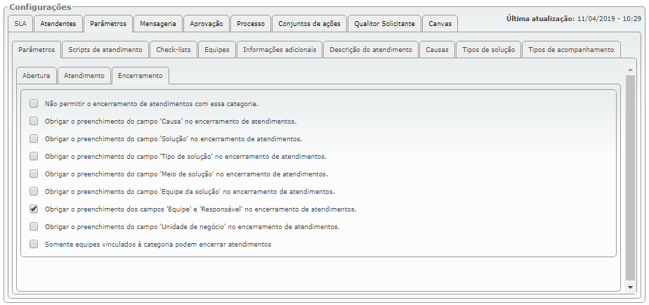 Essa subguia apresenta as parametrizações referente ao encerramento de atendimentos: