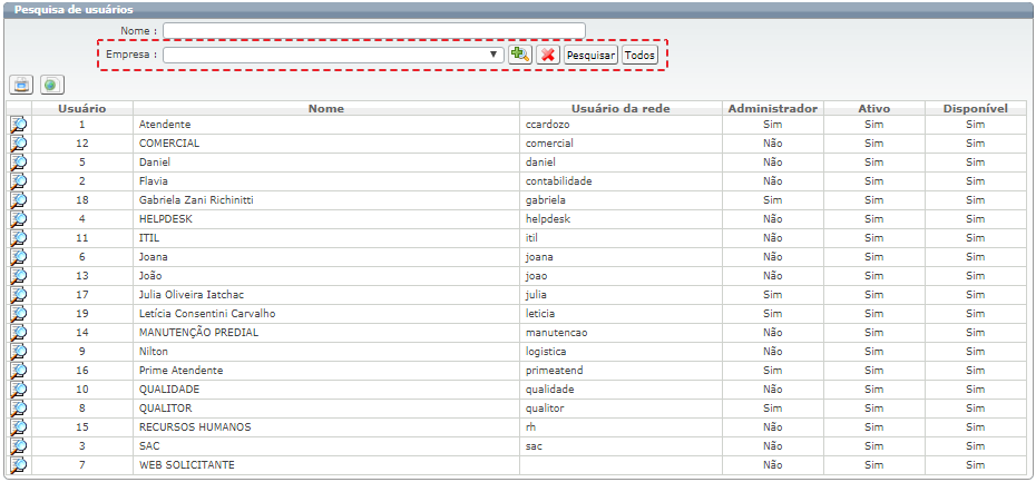 Desta forma, facilita a busca pelos usuários contidos em determinadas empresas a fim de ajudar na configuração do sistema pelo Administrador do Qualitor.