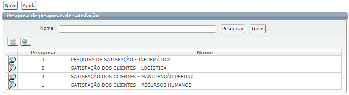 Para criar uma nova pesquisa, basta clicar no botão “Novo” e será exibida a tela de cadastro de pesquisa, que é divida em duas guias: